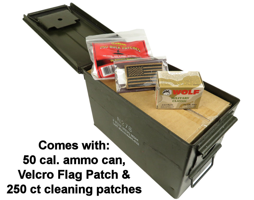 Package deal includes a .50 cal ammo can, Blackhawk! Velcro Flag Patch and a 250 ct bag of cleaning patches.