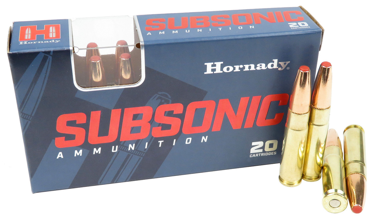 Notes: The Sub‑X bullet used in Hornady Subsonic features a lead core. Long grooves in its gilding metal jacket combine with the bullet’s flat profile and the patented Flex Tip® insert within its hollow point cavity to help it expand reliably at low velocities.
