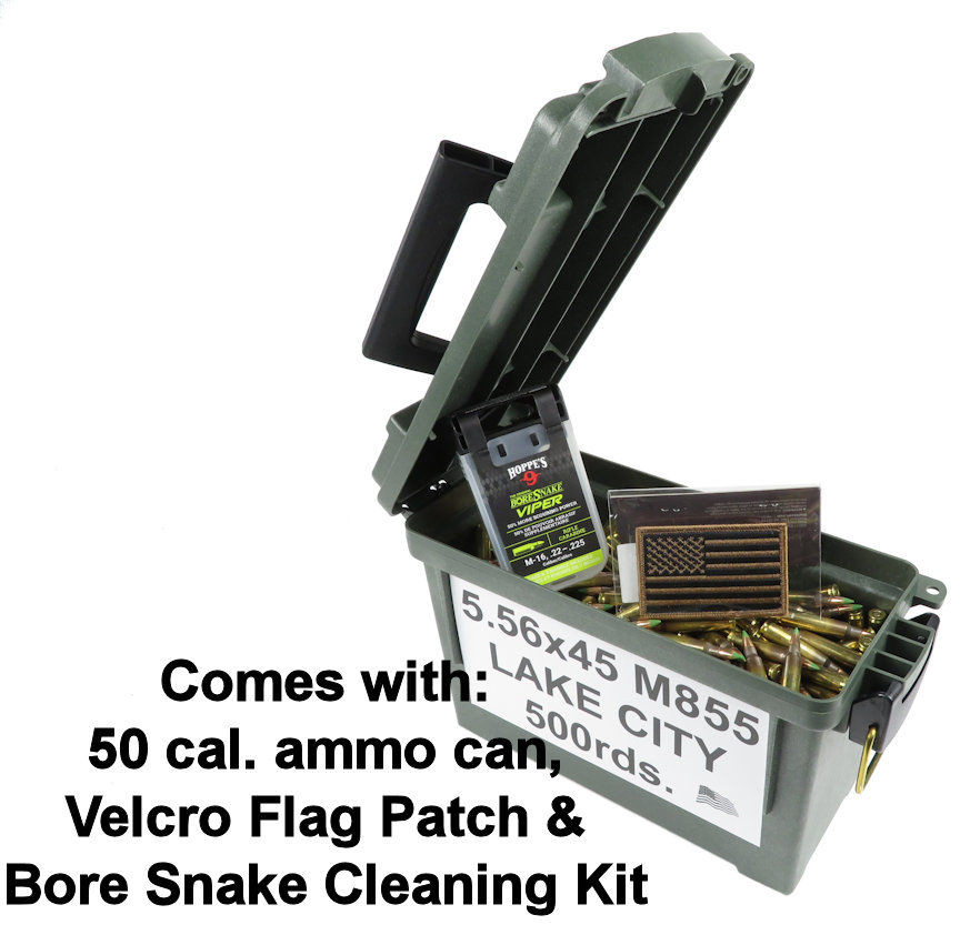 Package deal includes a plastic ammo can, Blackhawk! Velcro Flag Patch and a Hoppe's 223 Bore Snake