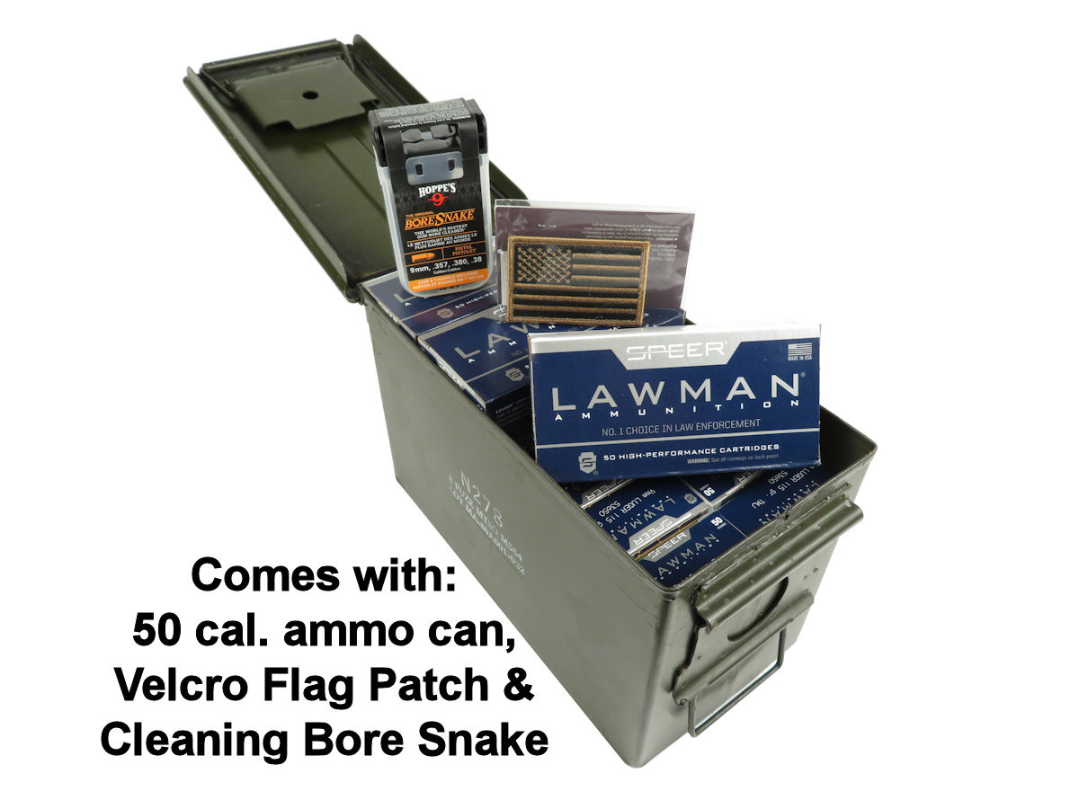 Package deal includes a .50 cal ammo can, Blackhawk! Velcro Flag Patch and a Hoppe's 9mm cleaning kit with bore snake.